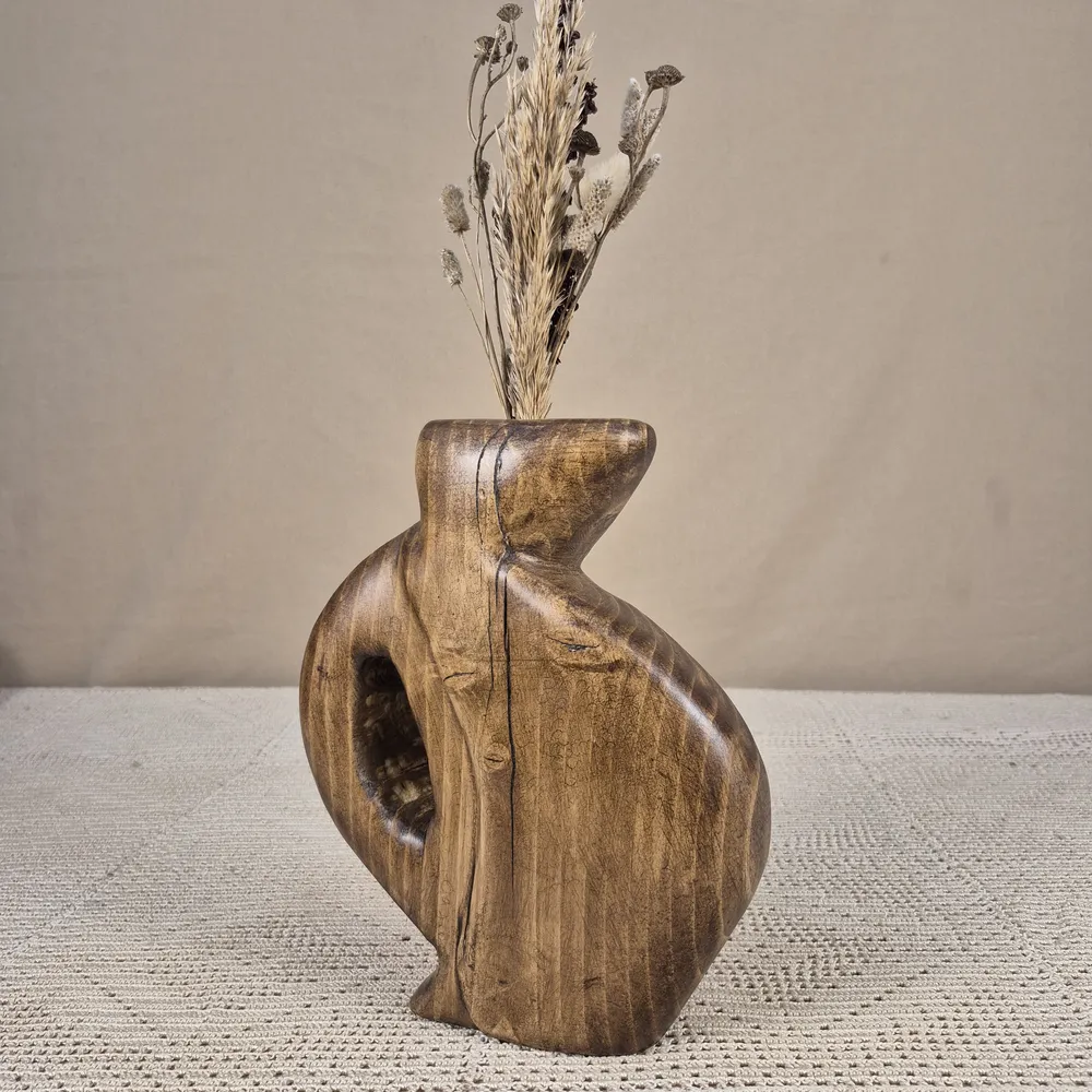 Laissez-vous séduire par la chaleur naturelle de ce vase artisanal. Il est conçu et façonné à la main. Ainsi, chaque pièce raconte une histoire unique. On le voit à travers les veinures et les nuances du bois.