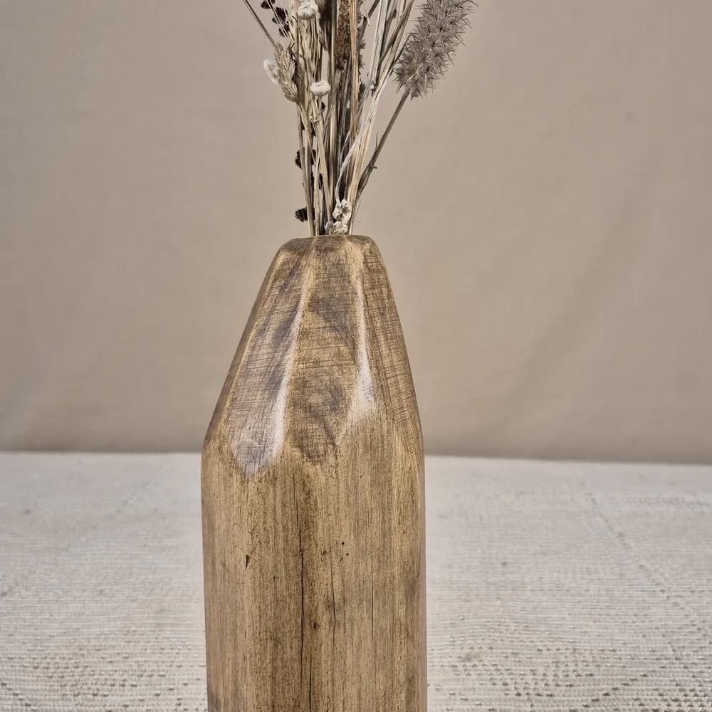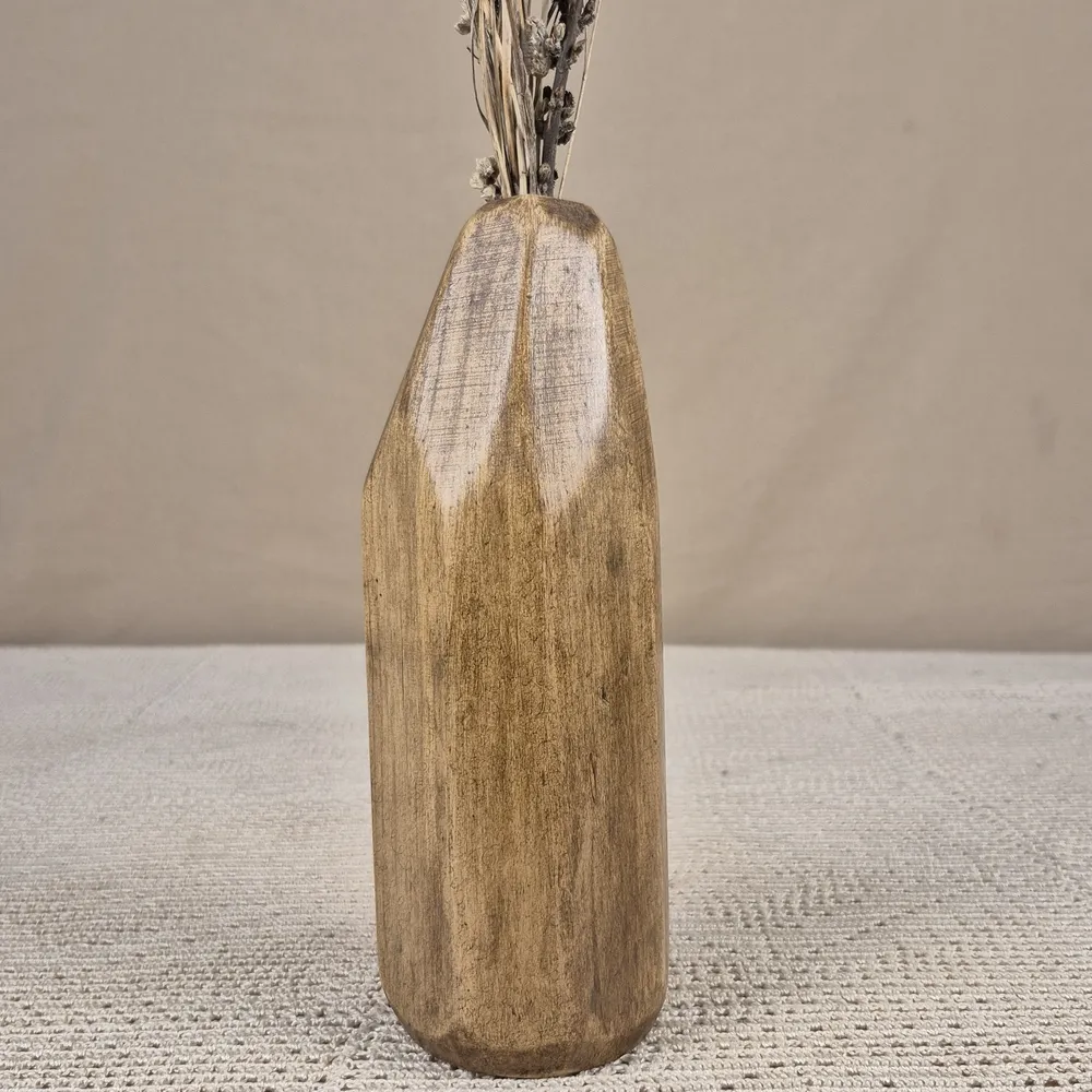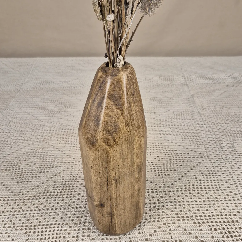 Laissez-vous séduire par la chaleur naturelle de ce vase décoratif. Il est conçu et façonné à la main. Ainsi, chaque pièce raconte une histoire unique. On le voit à travers les veinures et les nuances du bois.